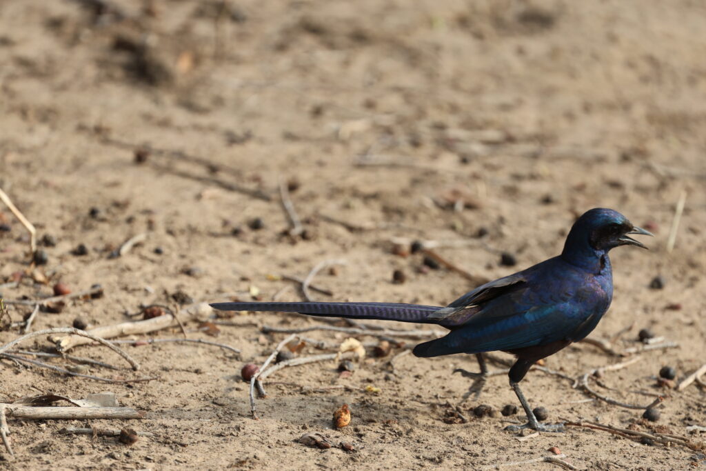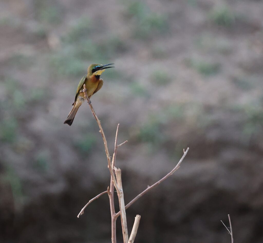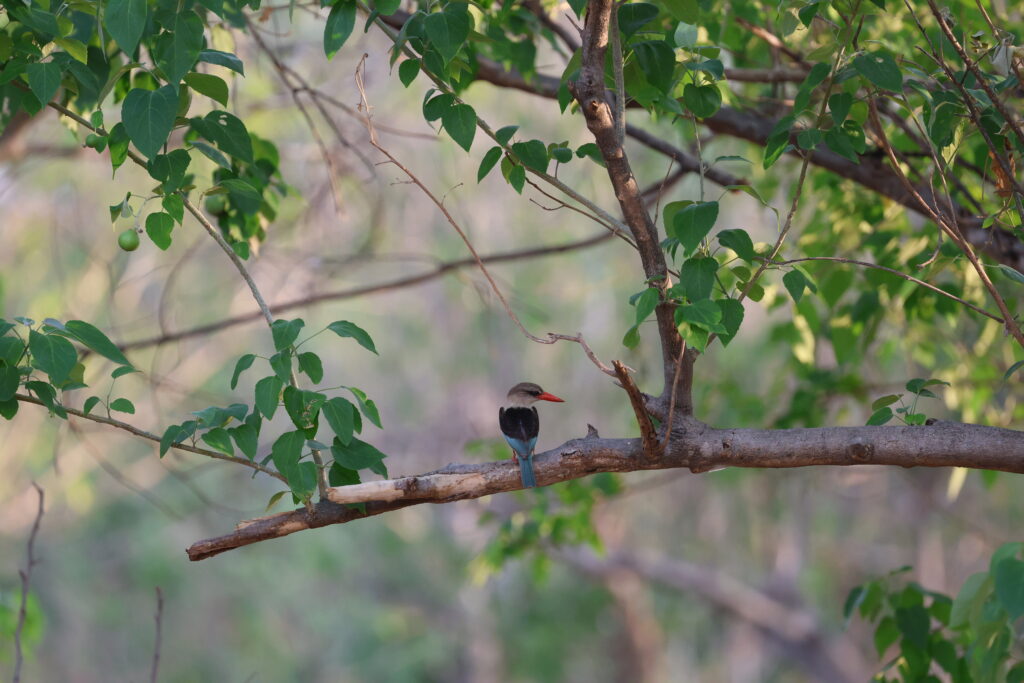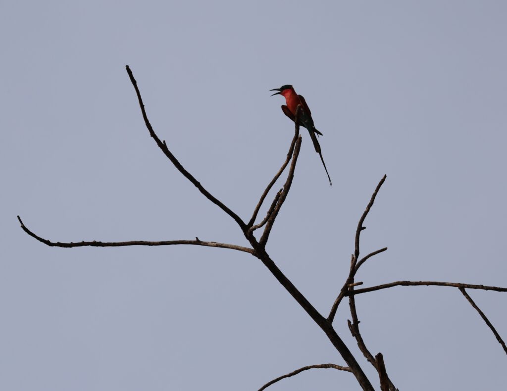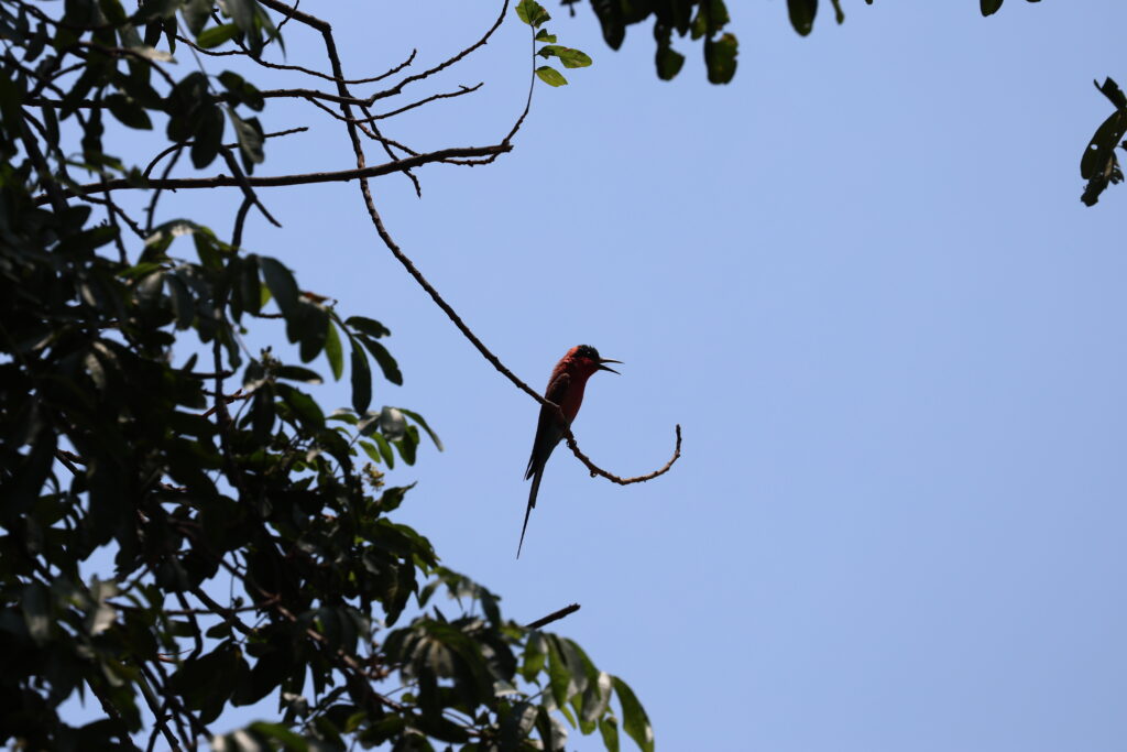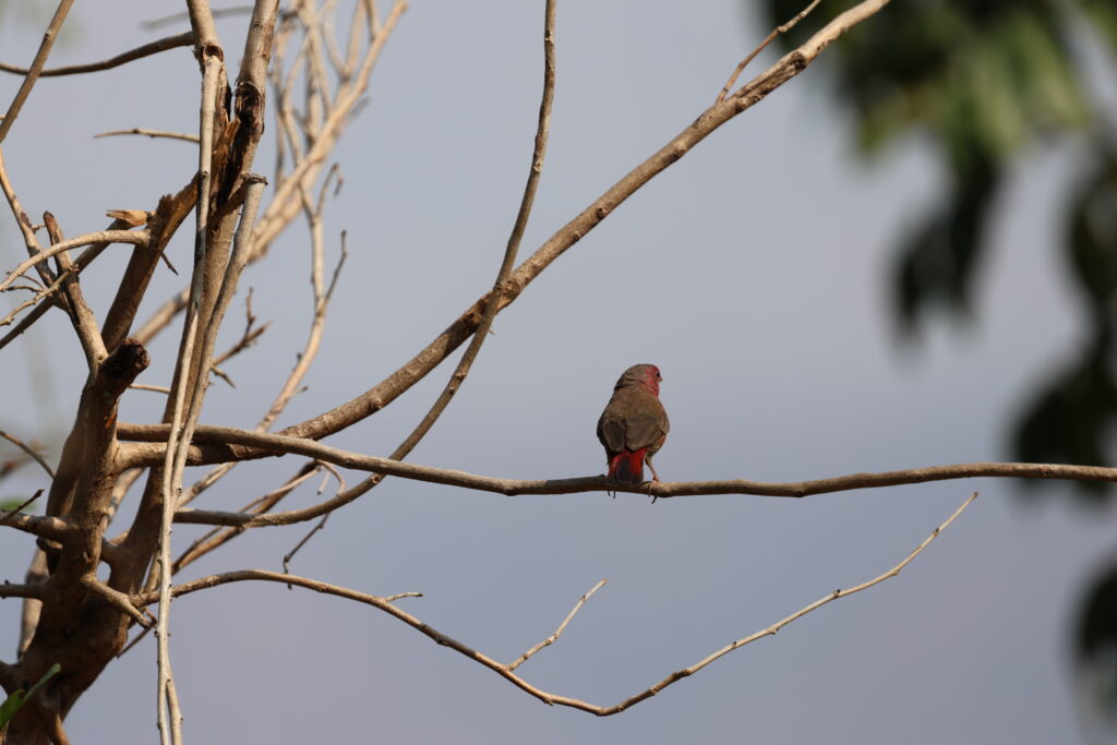 Dans les hauteurs, une Amarante à bec rouge ou Amarante du Sénégal